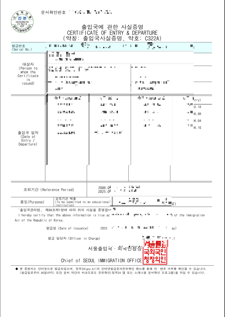 - 정부24 로그인 → ‘출입국사실증명’ 신청 → 전자문서지갑 수령 → PDF 저장 및 제출.